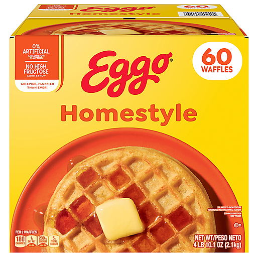 Wake up and greet the day with the feel-good taste of Eggo Homestyle waffles. Crispy and fluffy, our Eggo Homestyle waffles are crafted with delicious ingredients for part of a quick and easy breakfast. Pop these frozen waffles in the toaster or oven for a delightfully crisp texture and an inviting homemade taste. Feel good about what you're serving your family; 2 waffles provide a good source of 9 vitamins and minerals. Conveniently packaged and easy to prepare, Kellogg's Eggo Homestyle waffles help bring warmth and smiles to fast-paced, busy mornings. Great for families and individuals alike, these rich waffles are made to enjoy as part of a tasty breakfast. Try them with your favorite morning toppings, such as butter and syrup, jellies and jam, peanut butter, hazelnut spread, fresh fruit, berries, whipped cream, and powdered sugar. They're just so delicious, why would you L'Eggo your Eggo?