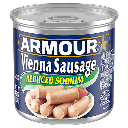 Armour Star Vienna Sausage, Reduced Sodium, is made with chicken, beef and pork added and is bursting with a delicious flavor. This sausage is made with 35% less sodium than Armour Original Vienna Sausage* and can be eaten right out of the can, so you can enjoy this canned meat on the go, as an easy snack in your pantry or as survival food in your emergency disaster kit. Do parties, camping and game days right; serve up Armour Star Original Vienna Sausage as a snack or appetizer. Make any time Armour Star time!