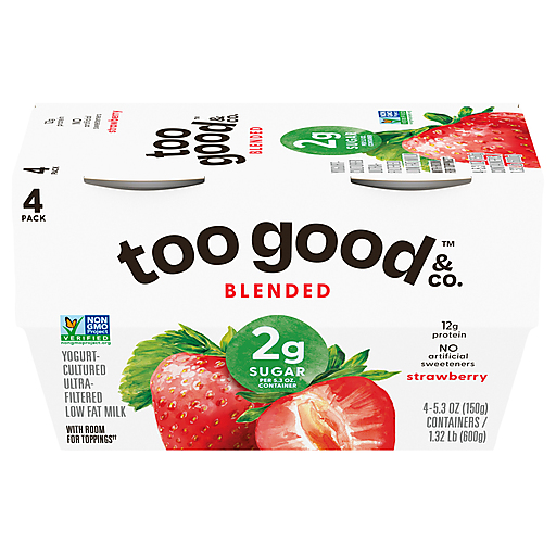 Brighten your day with a Too Good & Co. Strawberry Low Fat Greek Yogurt Cultured Product. Every 5.3 ounce creamy strawberry Greek yogurt serving is delightful with 80 calories, 2g of total sugar and 12g of protein. Plus, every serving has 80 percent less sugar than average Greek yogurts.** Invigorate your day with a Too Good & Co. Greek Low Fat Snack Cup. *Not a low calorie food. **Too Good & Co. Cups have 80 percent less sugar (2g per 5.3 oz) than average flavored and plain Greek yogurt (10g per 5.3 oz). ***For every unit sold, Too Good & Co. donates 1 cent to food rescue organizations. Learn more on packaging.